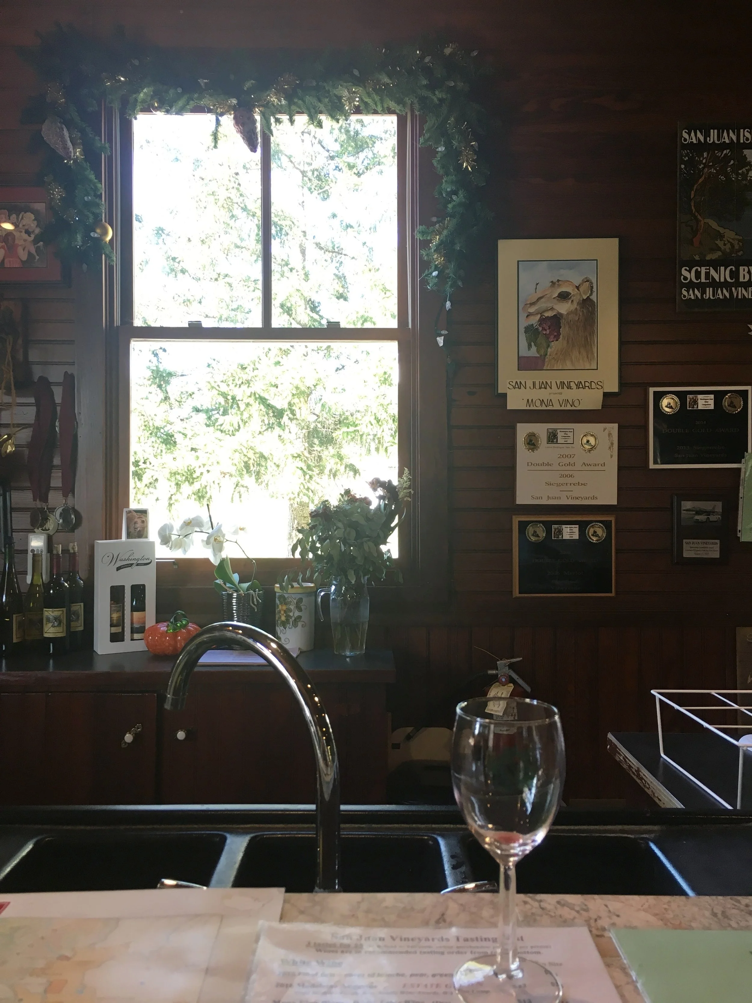 We were heading back to Friday Harbor to eat lunch and catch our return ferry when we spotted the San Juan Vineyards (and Scott spotted a camel... yes, a camel). Mona, the camel, was resting on the farm land across the street from the vineyard. She perked up to show off when I stepped out of the truck to take a picture of her glorious self. Over at San Juan Vineyards, we tasted the Mona Vino Blanc, complete with a label donning none other than... Mona the camel! This came home with us, of course. Along with their award winning Cab. Brenna was a wonderful host and gave us a little history of the property. The tasting room is the oldest school house on SJI dating back to 1895, and the walls still wear the original wood panels. A old-style school chalkboard graces the back wall for effect. Owner, Yvonne Swanberg opened SJV in 1996 and seems to keep the old world charm of the property very much in tact. A must stop if you pass through.